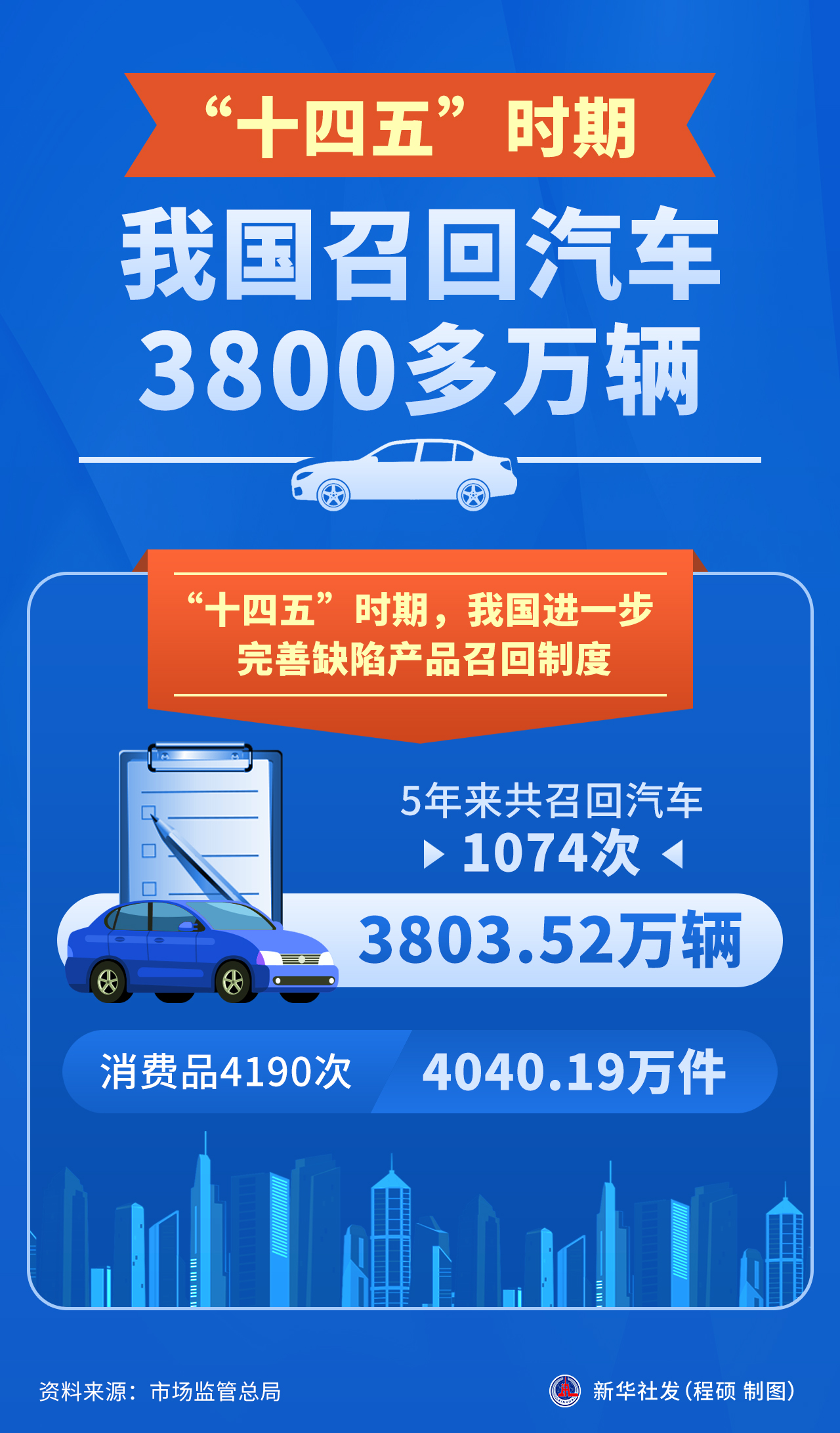新华社北京1月29日电 记者29日从市场监管总局获悉,“十四五”时期,我国进一步完善缺陷产品召回制度,5年来共召回汽车1074次、3803.52万辆,消费品4190次、4040.19万件。