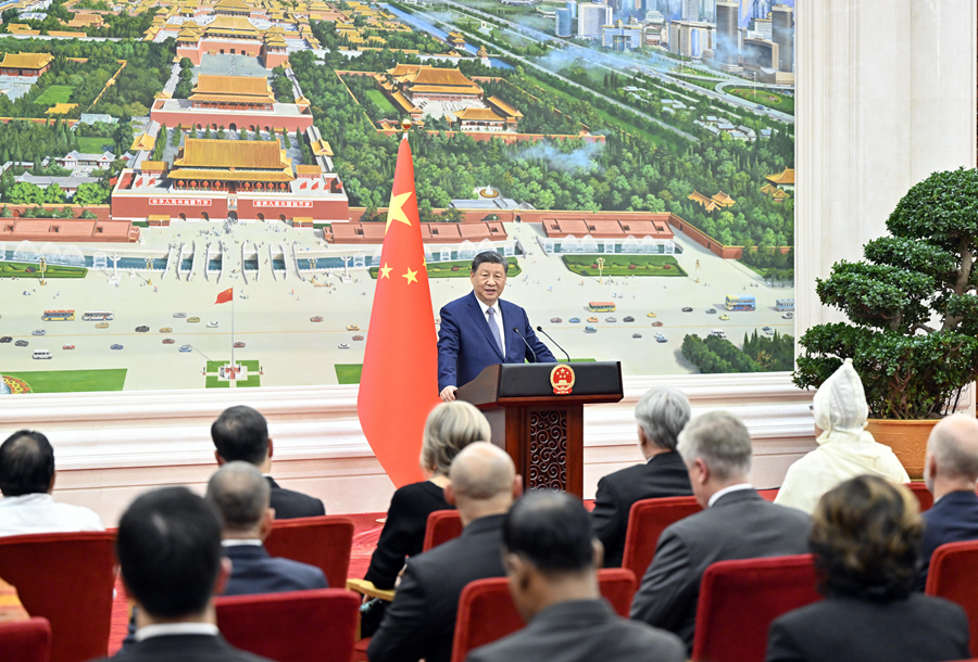 仪式结束后,习近平在北京厅对使节们发表讲话。
